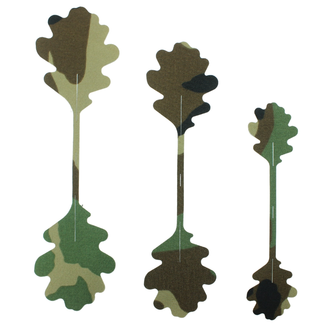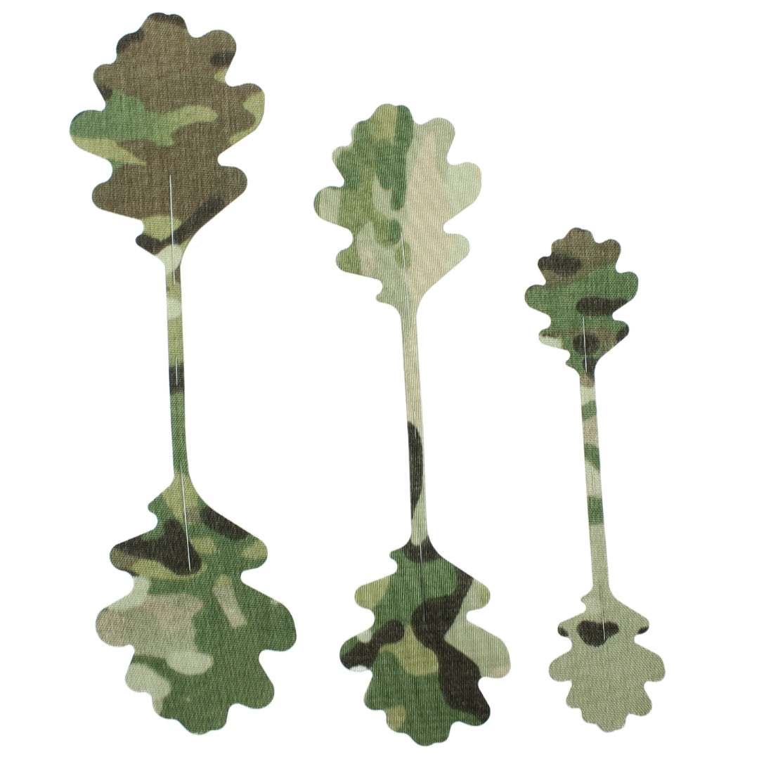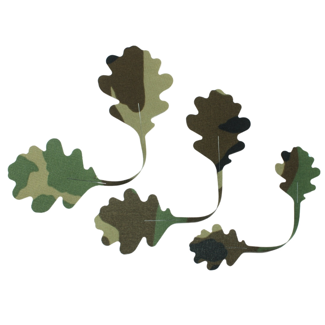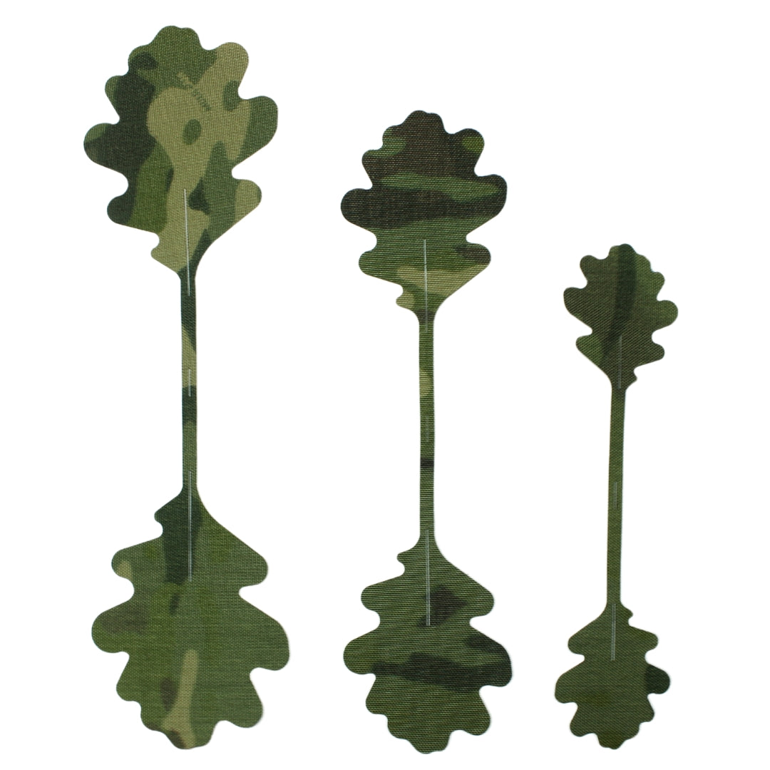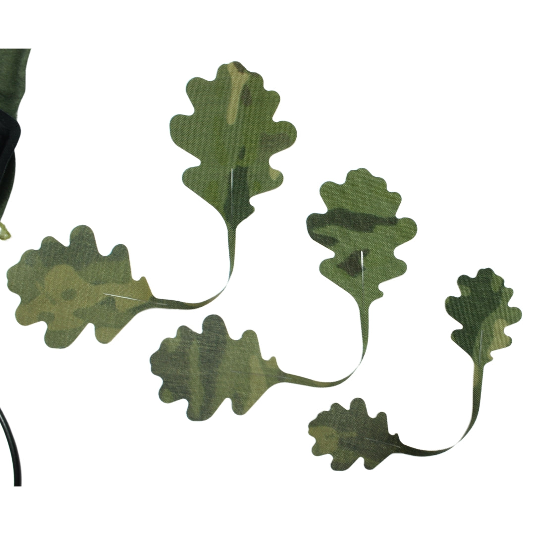 This version is inspired by the majestic oak tree, a staple of North American forests, our oak leaf design provides a realistic foliage pattern for optimal concealment. Each leaf is carefully crafted with unique curves at the ends to further break up the recognizable shape of your gear, equipment, and body, helping you blend seamlessly into natural surroundings.