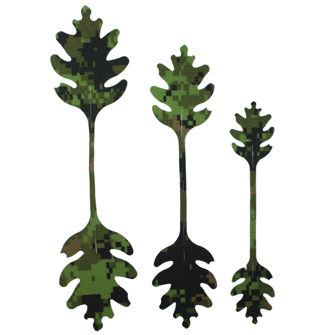 This version is inspired by the majestic oak tree, a staple of North American forests, our oak leaf design provides a realistic foliage pattern for optimal concealment. Each leaf is carefully crafted with unique curves at the ends to further break up the recognizable shape of your gear, equipment, and body, helping you blend seamlessly into natural surroundings.